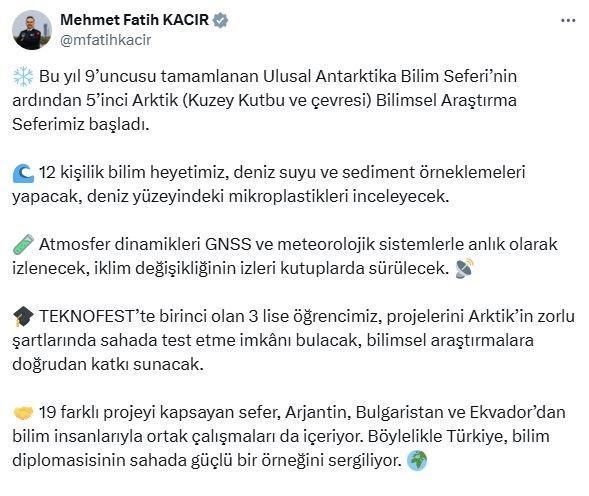 Bakan Kacır, sosyal medya hesabından yaptığı açıklamada, "Bu yıl 9'uncusu tamamlanan Ulusal Antarktika Bilim Seferi'nin ardından 5'inci Arktik (Kuzey Kutbu ve çevresi) Bilimsel Araştırma Seferimiz başladı. 12 kişilik bilim heyetimiz, deniz suyu ve sediment örneklemeleri yapacak, deniz yüzeyindeki mikroplastikleri inceleyecek. Atmosfer dinamikleri GNSS ve meteorolojik sistemlerle anlık olarak izlenecek, iklim değişikliğinin izleri kutuplarda sürülecek. TEKNOFEST’te birinci olan 3 lise öğrencimiz, projelerini Arktik’in zorlu şartlarında sahada test etme imkanı bulacak, bilimsel araştırmalara doğrudan katkı sunacak. 19 farklı projeyi kapsayan sefer, Arjantin, Bulgaristan ve Ekvador’dan bilim insanlarıyla ortak çalışmaları da içeriyor. Böylelikle Türkiye, bilim diplomasisinin sahada güçlü bir örneğini sergiliyor. Cumhurbaşkanımız Sayın Recep Tayyip Erdoğan'ın himayelerinde, Bakanlığımızın uhdesinde gerçekleştirdiğimiz kutup bilim seferleriyle; bilimle şekillenen bir gelecek için ülkemizin kutuplardaki varlığını artıracak adımlar atmaya devam edeceğiz" dedi.
