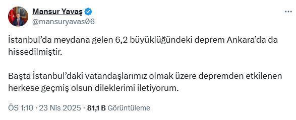 Afet ve Acil Durum Başkanlığı Deprem Dairesi’nin merkez üssünü Marmara Denizi’nde İstanbul’un Silivri ilçesi açıkları olarak saptadığı deprem, başkent Ankara’da da hissedildi. Sarsıntıyı hisseden bazı vatandaşlar binalardan dışarı çıktı. Ankara Büyükşehir Belediye Başkanı Mansur Yavaş, sosyal medya hesabından yaptığı açıklamada, "İstanbul'da meydana gelen 6.2 büyüklüğündeki deprem Ankara'da da hissedilmiştir. Başta İstanbul'daki vatandaşlarımız olmak üzere depremden etkilenen herkese geçmiş olsun dileklerimi iletiyorum" ifadelerini kullandı. (DHA)
