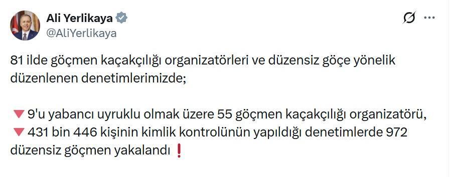İçişleri Bakanı Ali Yerlikaya, polis, jandarma ve Sahil Güvenlik tarafından gerçekleştirilen düzensiz göç denetimlerini sosyal medya hesabından duyurdu. Buna göre; 28 bin 581 personel ve 9 bin 109 ekip ile 5 bin 702 noktada yürütülen çalışmalarda 7 bin 617 umuma açık yer, 500 terminal ve 7 bin 37 diğer yerler olmak üzere toplam 15 bin 154 yer kontrol edildi, 431 bin 446 kişinin kimlik kontrolünün yapıldı. 9'u yabancı uyruklu 55 göçmen kaçakçılığı organizatörü ve 972 düzensiz göçmen yakalandı.