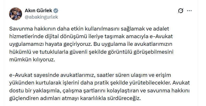 ANKARA, (DHA)- ADALET Bakanı Akın Gürlek, "Savunma hakkının daha etkin kullanılmasını sağlamak ve adalet hizmetlerinde dijital dönüşümü ileriye taşımak amacıyla e-Avukat uygulamamızı hayata geçiriyoruz" dedi.
