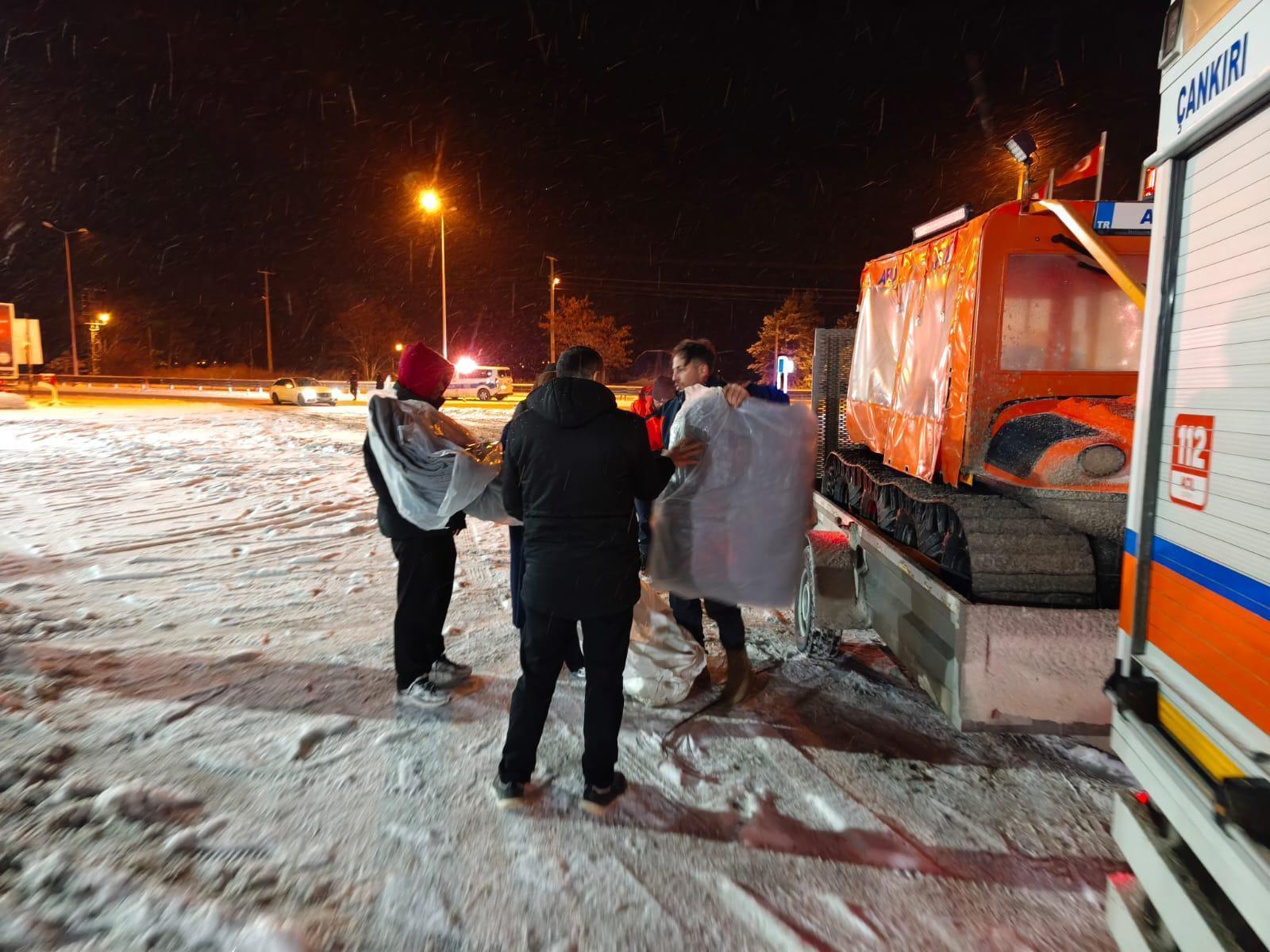 AFAD tarafından sanal medya üzerinden yapılan açıklamada, "Yoğun kar yağışının yaşandığı illerimizdeki gelişmeler AFAD Başkanlığımız tarafından yakından takip edilmekte, Türkiye Afet Müdahale Planı (TAMP) kapsamında gerekli çalışmalar yürütülmektedir. Bahse konu illerimizde Afet ve Acil Durum Yönetim Merkezleri toplanmış olup kurumlar arasında koordinasyon sağlanmaktadır. Kar yağışının yoğunlaşması nedeniyle ulaşıma kapanan Bolu/Gerede-Karabük-Çankırı/Çerkeş yollarında, Karayolları Genel Müdürlüğü ekiplerince yol açma çalışmaları aralıksız sürdürülürken, yolda kalan vatandaşlarımıza AFAD ve Kızılay ekiplerimiz tarafından gerekli destekler sağlanmaktadır. Bu kapsamda AFAD tarafından 178 personel ve 47 araç, Türk Kızılay tarafından ise 16 personel ve 4 araç, Bolu-Gerede, Karabük ve Çankırı-Çerkez'de sahada görev yapmaktadır. Yolda mahsur kalan vatandaşlarımıza 782 kumanya ve 600 battaniye yardımı yapılmıştır. Vatandaşlarımızın, başta buzlanma ve don olayına bağlı ulaşımda aksamalar ile yerde kar örtüsü olan yüksek ve eğimli alanlarda çığ riski gibi olumsuzluklara karşı dikkatli ve tedbirli olmalarını; yetkili mercilerin uyarılarını dikkate almalarını önemle hatırlatıyoruz. Gelişmeler takip edilmektedir" ifadelerine yer verildi. (DHA)