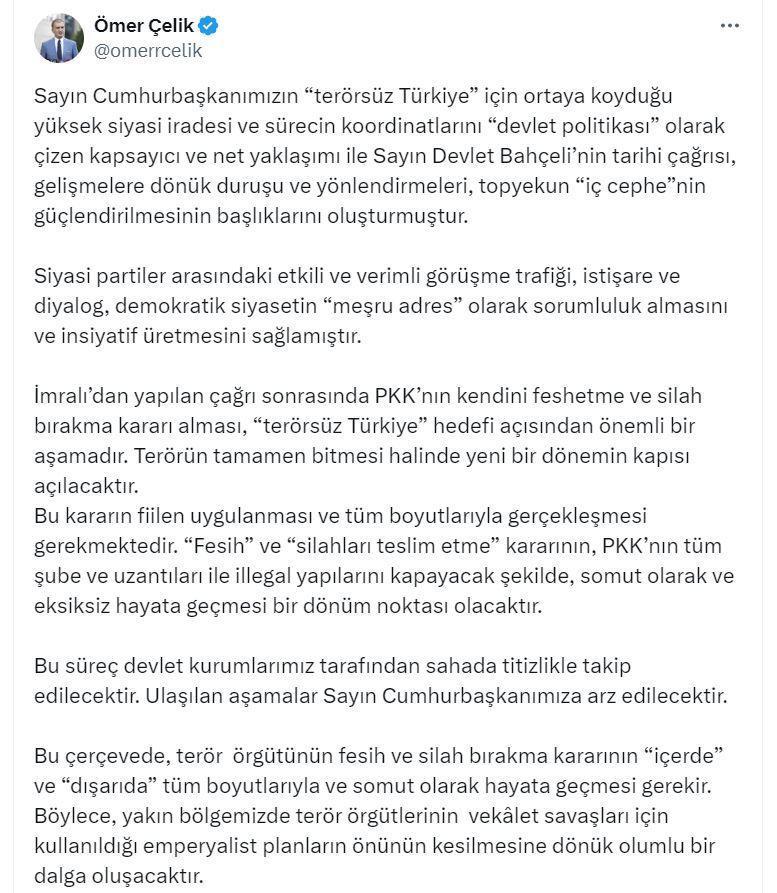 AK Parti Sözcüsü Çelik, sosyal medya hesabından yaptığı açıklamada, "Sayın Cumhurbaşkanımızın 'Terörsüz Türkiye' için ortaya koyduğu yüksek siyasi iradesi ve sürecin koordinatlarını 'devlet politikası' olarak çizen kapsayıcı ve net yaklaşımı ile Sayın Devlet Bahçeli'nin tarihi çağrısı, gelişmelere dönük duruşu ve yönlendirmeleri, topyekun 'iç cephe'nin güçlendirilmesinin başlıklarını oluşturmuştur. Siyasi partiler arasındaki etkili ve verimli görüşme trafiği, istişare ve diyalog, demokratik siyasetin 'meşru adres' olarak sorumluluk almasını ve inisiyatif üretmesini sağlamıştır. İmralı'dan yapılan çağrı sonrasında PKK'nın kendini feshetme ve silah bırakma kararı alması, 'Terörsüz Türkiye' hedefi açısından önemli bir aşamadır" dedi.