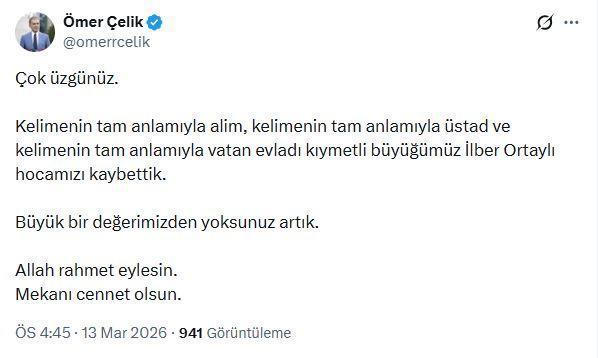 AK Parti'li Ömer Çelik, sanal medya hesabından paylaştığı mesajında, "Çok üzgünüz. Kelimenin tam anlamıyla alim, kelimenin tam anlamıyla üstad ve kelimenin tam anlamıyla vatan evladı kıymetli büyüğümüz İlber Ortaylı hocamızı kaybettik. Büyük bir değerimizden yoksunuz artık. Allah rahmet eylesin. Mekanı cennet olsun" ifadelerini kullandı. (DHA)