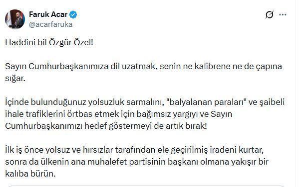 AK Parti Genel Başkan Yardımcısı Faruk Acar, sanal medya üzerinden yaptığı paylaşımda, "Haddini bil Özgür Özel. Sayın Cumhurbaşkanımıza dil uzatmak, senin ne kalibrene ne de çapına sığar. İçinde bulunduğunuz yolsuzluk sarmalını, ‘Balyalanan paraları’ ve şaibeli ihale trafiklerini örtbas etmek için bağımsız yargıyı ve Sayın Cumhurbaşkanımızı hedef göstermeyi de artık bırak. İlk iş önce yolsuz ve hırsızlar tarafından ele geçirilmiş iradeni kurtar, sonra da ülkenin ana muhalefet partisinin başkanı olmana yakışır bir kalıba bürün" ifadelerini kullandı. (DHA)