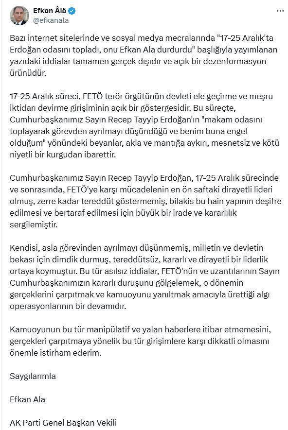 AK Parti Genel Başkan Vekili Efkan Ala, sosyal medya hesabından yaptığı açıklamada, bazı internet sitelerinde ve sosyal medya mecralarında '17-25 Aralık'ta Erdoğan odasını topladı, onu Efkan Ala durdurdu' başlığıyla yazı yayımlandığını belirterek, "Yazıdaki iddialar tamamen gerçek dışıdır ve açık bir dezenformasyon ürünüdür. 17-25 Aralık süreci, FETÖ terör örgütünün devleti ele geçirme ve meşru iktidarı devirme girişiminin açık bir göstergesidir. Bu süreçte, Cumhurbaşkanımız Sayın Recep Tayyip Erdoğan'ın 'makam odasını toplayarak görevden ayrılmayı düşündüğü ve benim buna engel olduğum' yönündeki beyanlar, akla ve mantığa aykırı, mesnetsiz ve kötü niyetli bir kurgudan ibarettir. Cumhurbaşkanımız Sayın Recep Tayyip Erdoğan, 17-25 Aralık sürecinde ve sonrasında, FETÖ'ye karşı mücadelenin en ön saftaki dirayetli lideri olmuş, zerre kadar tereddüt göstermemiş, bilakis bu hain yapının deşifre edilmesi ve bertaraf edilmesi için büyük bir irade ve kararlılık sergilemiştir. Kendisi, asla görevinden ayrılmayı düşünmemiş, milletin ve devletin bekası için dimdik durmuş, tereddütsüz, kararlı ve dirayetli bir liderlik ortaya koymuştur. Bu tür asılsız iddialar, FETÖ'nün ve uzantılarının Sayın Cumhurbaşkanımızın kararlı duruşunu gölgelemek, o dönemin gerçeklerini çarpıtmak ve kamuoyunu yanıltmak amacıyla ürettiği algı operasyonlarının bir devamıdır. Kamuoyunun bu tür manipülatif ve yalan haberlere itibar etmemesini, gerçekleri çarpıtmaya yönelik bu tür girişimlere karşı dikkatli olmasını önemle istirham ederim" ifadelerini kullandı. (DHA)