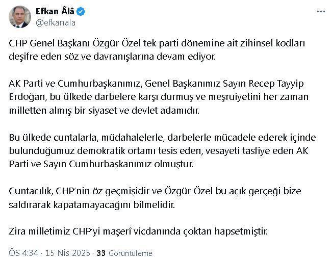 ANKARA, (DHA)- AK Parti Genel Başkan Vekili Efkan Ala, "Cuntacılık, CHP'nin öz geçmişidir ve Özgür Özel bu açık gerçeği bize saldırarak kapatamayacağını bilmelidir. Zira milletimiz CHP'yi maşeri vicdanında çoktan hapsetmiştir" dedi.