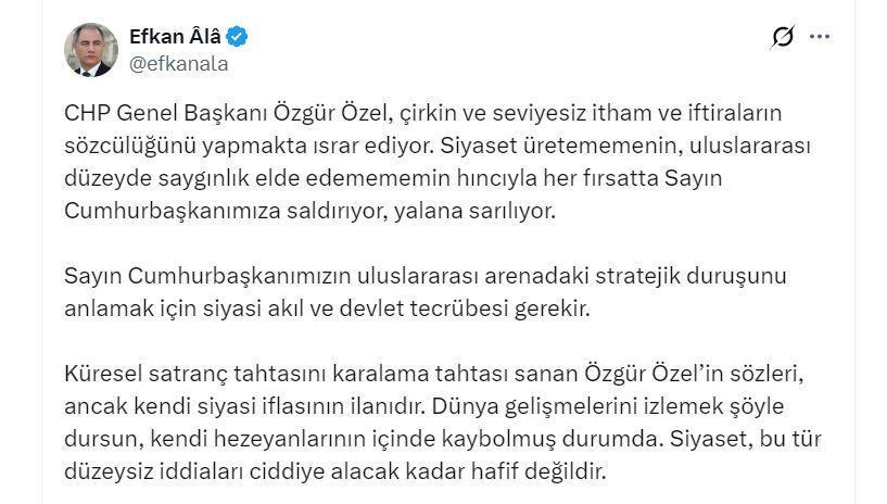 ANKARA, (DHA)- AK Parti Genel Başkan Vekili Efkan Ala, CHP Genel Başkanı Özgür Özel'in Cumhurbaşkanı Recep Tayyip Erdoğan'a yönelik sözleriyle ilgili, "Küresel satranç tahtasını karalama tahtası sanan Özgür Özel'in sözleri, ancak kendi siyasi iflasının ilanıdır" dedi.