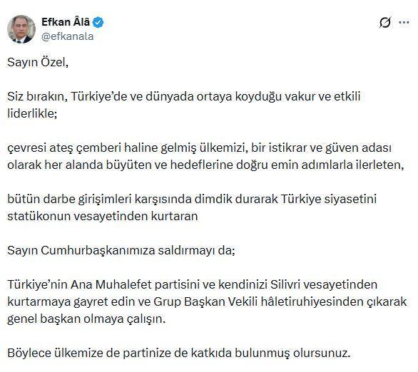 Efkan Ala, sanal medya hesabından yaptığı açıklamada, "Sayın Özel, siz bırakın, Türkiye’de ve dünyada ortaya koyduğu vakur ve etkili liderlikle; çevresi ateş çemberi haline gelmiş ülkemizi, bir istikrar ve güven adası olarak her alanda büyüten ve hedeflerine doğru emin adımlarla ilerleten, bütün darbe girişimleri karşısında dimdik durarak Türkiye siyasetini statükonun vesayetinden kurtaran Sayın Cumhurbaşkanımıza saldırmayı da; Türkiye’nin ana muhalefet partisini ve kendinizi Silivri vesayetinden kurtarmaya gayret edin ve grup başkan vekili haletiruhiyesinden çıkarak genel başkan olmaya çalışın. Böylece ülkemize de partinize de katkıda bulunmuş olursunuz" dedi. (DHA)