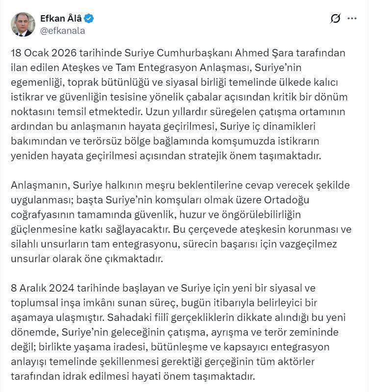 AK Parti Genel Başkan Vekili Efkan Ala, Suriye'deki gelişmelere ilişkin sanal medya hesabından açıklama yaptı. Ala, "18 Ocak 2026 tarihinde Suriye Cumhurbaşkanı Ahmed Şara tarafından ilan edilen Ateşkes ve Tam Entegrasyon Anlaşması, Suriye’nin egemenliği, toprak bütünlüğü ve siyasal birliği temelinde ülkede kalıcı istikrar ve güvenliğin tesisine yönelik çabalar açısından kritik bir dönüm noktasını temsil etmektedir. Uzun yıllardır süregelen çatışma ortamının ardından bu anlaşmanın hayata geçirilmesi, Suriye iç dinamikleri bakımından ve terörsüz bölge bağlamında komşumuzda istikrarın yeniden hayata geçirilmesi açısından stratejik önem taşımaktadır. Anlaşmanın, Suriye halkının meşru beklentilerine cevap verecek şekilde uygulanması; başta Suriye'nin komşuları olmak üzere Orta Doğu coğrafyasının tamamında güvenlik, huzur ve öngörülebilirliğin güçlenmesine katkı sağlayacaktır. Bu çerçevede ateşkesin korunması ve silahlı unsurların tam entegrasyonu, sürecin başarısı için vazgeçilmez unsurlar olarak öne çıkmaktadır" ifadelerini kullandı.