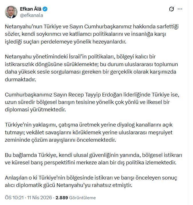 AK Parti Genel Başkanvekili Efkan Ala, sanal medya hesabı üzerinden yaptığı paylaşımda, "Netanyahu’nun Türkiye ve Sayın Cumhurbaşkanımız hakkında sarf ettiği sözler, kendi soykırımcı ve katliamcı politikalarını ve insanlığa karşı işlediği suçları perdelemeye yönelik hezeyanlardır. Netanyahu yönetimindeki İsrail’in politikaları, bölgeyi kalıcı bir istikrarsızlık döngüsüne sürüklemekte; bu durum uluslararası toplumun daha yüksek sesle sorgulaması gereken bir gerçeklik olarak karşımızda durmaktadır. Cumhurbaşkanımız Sayın Recep Tayyip Erdoğan liderliğinde Türkiye ise, uzun süredir bölgesel barışın tesisine yönelik çok yönlü ve ilkesel bir diplomasi yürütmektedir. Türkiye’nin yaklaşımı, çatışma üretmek yerine diyalog kanallarını açık tutmayı; vekalet savaşlarını körüklemek yerine uluslararası meşruiyet zemininde çözüm arayışlarını öncelemektedir. Bu bağlamda Türkiye, kendi ulusal güvenliğinin yanında, bölgesel istikrarı ve küresel barış perspektifini merkeze alan bir dış politika izlemektedir. Anlaşılan o ki Türkiye’nin bölgesinde istikrarı ve barışı önceleyen sonuç alıcı diplomatik gücü Netanyahu’yu rahatsız etmiştir" ifadelerini kullandı. (DHA)