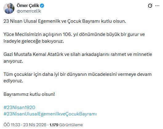 ANKARA, (DHA)- AK Parti Genel Başkan Yardımcısı ve Parti Sözcüsü Ömer Çelik, 23 Nisan Ulusal Egemenlik ve Çocuk Bayramı ile TBMM'nin kuruluşunun 106'ncı yıl dönümüne ilişkin mesaj paylaştı.