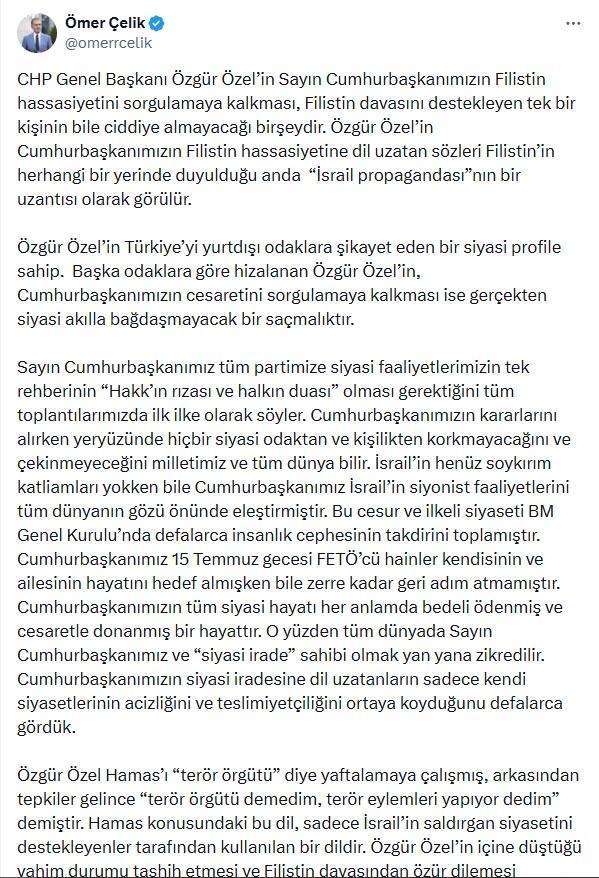 Çelik, Özgür Özel'in Hamas’ı 'terör örgütü' diye yaftalamaya çalıştığını, arkasından tepkiler gelince 'Terör örgütü demedim, terör eylemleri yapıyor dedim' dediğini ifade ederek, "Hamas konusundaki bu dil, sadece İsrail’in saldırgan siyasetini destekleyenler tarafından kullanılan bir dildir. Özgür Özel’in içine düştüğü vahim durumu tashih etmesi ve Filistin davasından özür dilemesi gerekirken, Filistin konusuna güdümlü merceklerden bakarak konuşması başlı başına bir trajedidir. Cumhurbaşkanımız ise siyasi yasaklı olduğu dönemde bile ABD’de kendisine Hamas hakkında sorulan bir soruya cevaben 'Onlara terörist denmesi asla doğru değildir. Onlar vatanlarını İsrail işgaline karşı savunan vatanseverlerdir' demiştir" dedi.