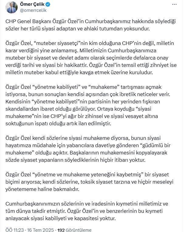 ANKARA, (DHA)- AK Parti Sözcüsü Ömer Çelik, "CHP Genel Başkanı Özgür Özel’in Cumhurbaşkanımız hakkında söylediği sözler her türlü siyasi adaptan ve ahlaki tutumdan yoksundur" dedi.