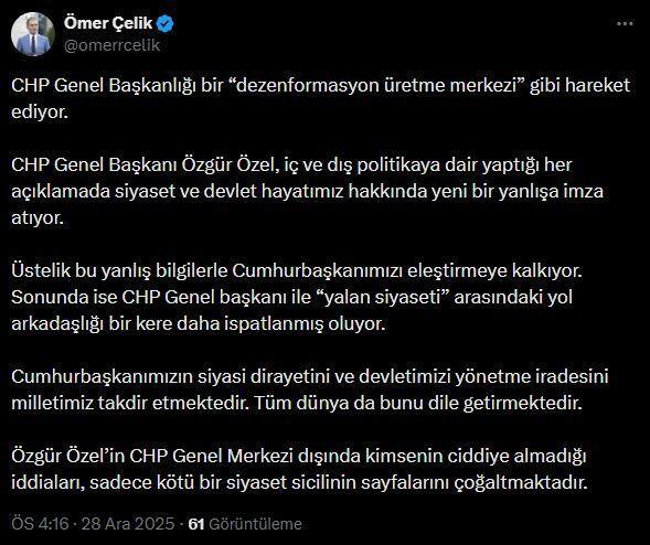 ANKARA, (DHA)- AK Parti Genel Başkan Yardımcısı ve Parti Sözcüsü Ömer Çelik, "CHP Genel Başkanlığı bir 'dezenformasyon üretme merkezi' gibi hareket ediyor. CHP Genel Başkanı Özgür Özel, iç ve dış politikaya dair yaptığı her açıklamada siyaset ve devlet hayatımız hakkında yeni bir yanlışa imza atıyor" dedi.