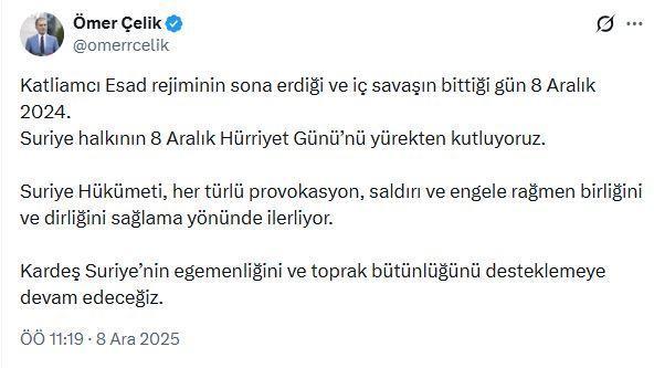 ANKARA, (DHA)- AK Parti Genel Başkan Yardımcısı ve Parti Sözcüsü Ömer Çelik, "Suriye halkının '8 Aralık Hürriyet Günü'nü yürekten kutluyoruz. Kardeş Suriye’nin egemenliğini ve toprak bütünlüğünü desteklemeye devam edeceğiz" dedi.