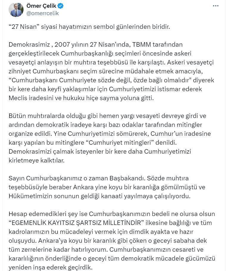 AK Parti Sözcüsü Çelik, sosyal medya hesabından yayımladığı mesajda, "27 Nisan, siyasi hayatımızın sembol günlerinden biridir. Demokrasimiz, 2007 yılının 27 Nisan'ında, TBMM tarafından gerçekleştirilecek Cumhurbaşkanlığı seçimleri öncesinde askeri vesayetçi anlayışın bir muhtıra teşebbüsü ile karşılaştı. Askeri vesayetçi zihniyet Cumhurbaşkanı seçim sürecine müdahale etmek amacıyla, 'Cumhurbaşkanı Cumhuriyete sözde değil, özde bağlı olmalıdır' diyerek bir kere daha keyfi yaklaşımlar için Cumhuriyetimizi istismar ederek Meclis iradesini ve hukuku hiçe sayma yoluna gitti. Bütün muhtıralarda olduğu gibi hemen yargı vesayeti devreye girdi ve ardından demokratik iradeye karşı bazı odaklar tarafından mitingler organize edildi. Yine Cumhuriyetimizi sömürerek, Cumhur'un iradesine karşı yapılan bu mitinglere 'Cumhuriyet mitingleri' denildi. Demokrasimizi çalmak isteyenler bir kere daha Cumhuriyetimizi kirletmeye kalktılar" ifadelerini kullandı.