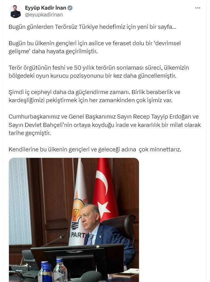 ANKARA, (DHA)- AK Parti Genel Sekreteri ve İzmir Milletvekili Eyyüp Kadir İnan, "Terör örgütünün feshi ve 50 yıllık terörün sonlaması süreci, ülkemizin bölgedeki oyun kurucu pozisyonunu bir kez daha güncellemiştir. Şimdi iç cepheyi daha da güçlendirme zamanı. Birlik beraberlik ve kardeşliğimizi pekiştirmek için her zamankinden çok işimiz var" dedi.