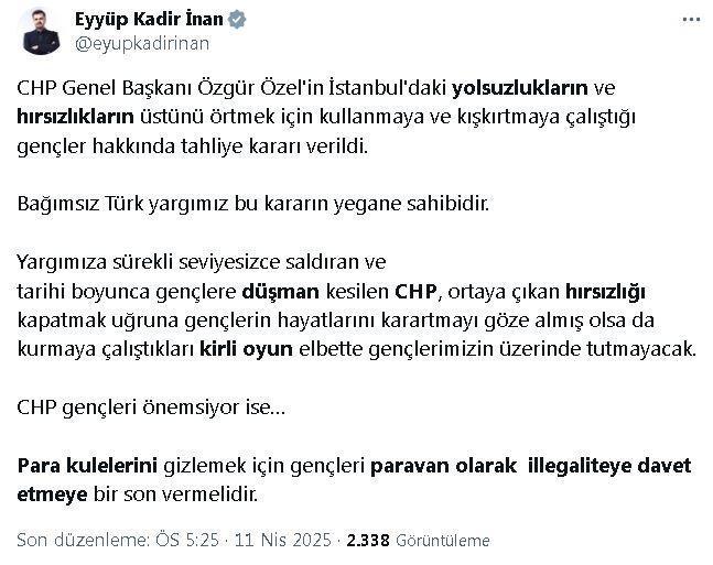 AK Parti'li Eyüp Kadir İnan, sosyal medya hesabından yaptığı açıklamada, "CHP Genel Başkanı Özgür Özel'in İstanbul'daki yolsuzlukların ve hırsızlıkların üstünü örtmek için kullanmaya ve kışkırtmaya çalıştığı gençler hakkında tahliye kararı verildi. Bağımsız Türk yargımız bu kararın yegane sahibidir. Yargımıza sürekli seviyesizce saldıran ve tarihi boyunca gençlere düşman kesilen CHP, ortaya çıkan hırsızlığı kapatmak uğruna gençlerin hayatlarını karartmayı göze almış olsa da kurmaya çalıştıkları kirli oyun elbette gençlerimizin üzerinde tutmayacak. CHP gençleri önemsiyor ise para kulelerini gizlemek için gençleri paravan olarak illegaliteye davet etmeye bir son vermelidir" ifadelerini kullandı. (DHA)