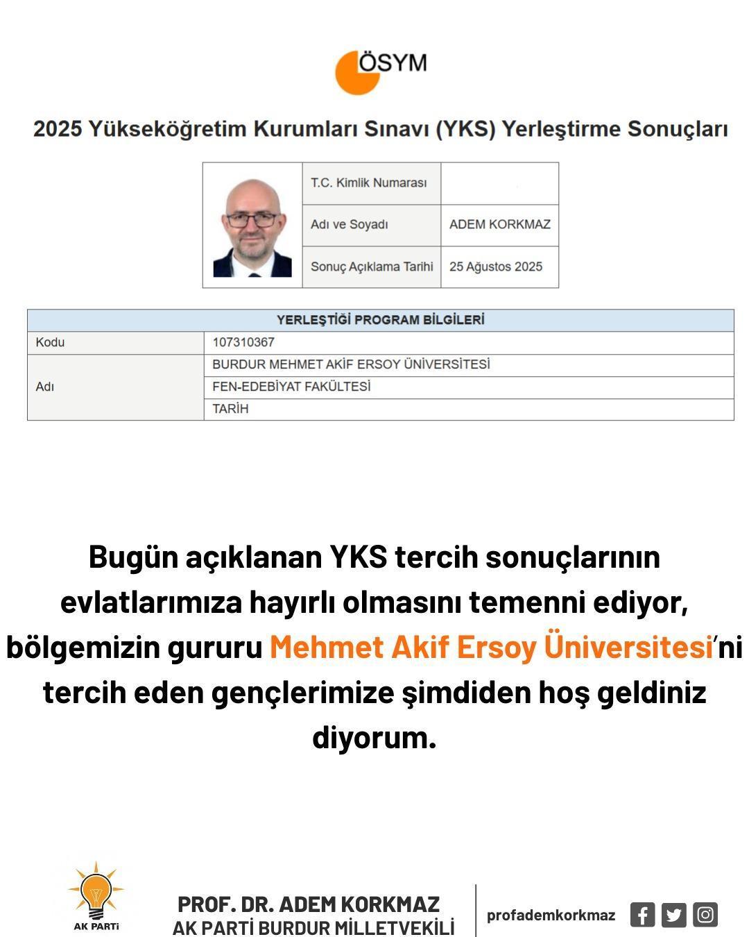 Aliekber METE/ANKARA, (DHA)- AK Parti Burdur Milletvekili Adem Korkmaz, Yükseköğretim Kurumları Sınavı'na (YKS) girerek, iki dönem rektörlüğünü yaptığı Burdur Mehmet Akif Ersoy Üniversitesi (MAKÜ) Fen-Edebiyat Fakültesi Tarih Bölümü'ne 1’incilikle yerleşti.