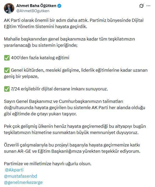 ANKARA, (DHA)- AK Parti Genel Başkan Yardımcısı Ahmet Baha Öğütken, "AK Parti olarak önemli bir adım daha attık. Partimiz bünyesinde Dijital Eğitim Yönetim Sistemi'ni hayata geçirdik" dedi.
