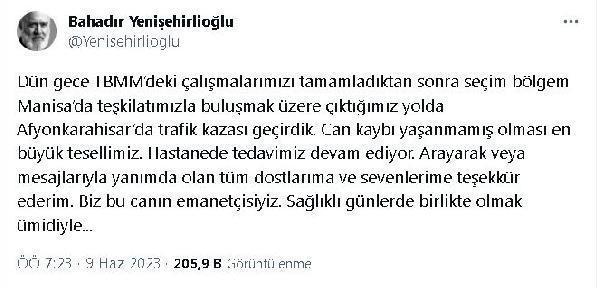 Yenişehirlioğlu, Twitter hesabından yaptığı açıklamada, "Dün gece TBMM'deki çalışmalarımızı tamamladıktan sonra seçim bölgem Manisa'da teşkilatımızla buluşmak üzere çıktığımız yolda Afyonkarahisar'da trafik kazası geçirdik. Can kaybı yaşanmamış olması en büyük tesellimiz. Hastanede tedavimiz devam ediyor. Arayarak veya mesajlarıyla yanımda olan tüm dostlarıma ve sevenlerime teşekkür ederim. Biz bu canın emanetçisiyiz. Sağlıklı günlerde birlikte olmak ümidiyle" ifadelerini kullandı. (DHA)