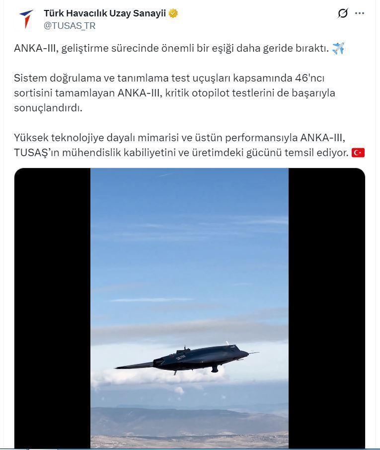 TUSAŞ'ın sosyal medya hesabında ANKA-3'ün test uçuşlarından görüntüler paylaşılarak, "ANKA-3, geliştirme sürecinde önemli bir eşiği daha geride bıraktı. Sistem doğrulama ve tanımlama test uçuşları kapsamında 46'ncı sortisini tamamlayan ANKA-3, kritik otopilot testlerini de başarıyla sonuçlandırdı. Yüksek teknolojiye dayalı mimarisi ve üstün performansıyla ANKA-3, TUSAŞ'ın mühendislik kabiliyetini ve üretimdeki gücünü temsil ediyor" denildi. (DHA)