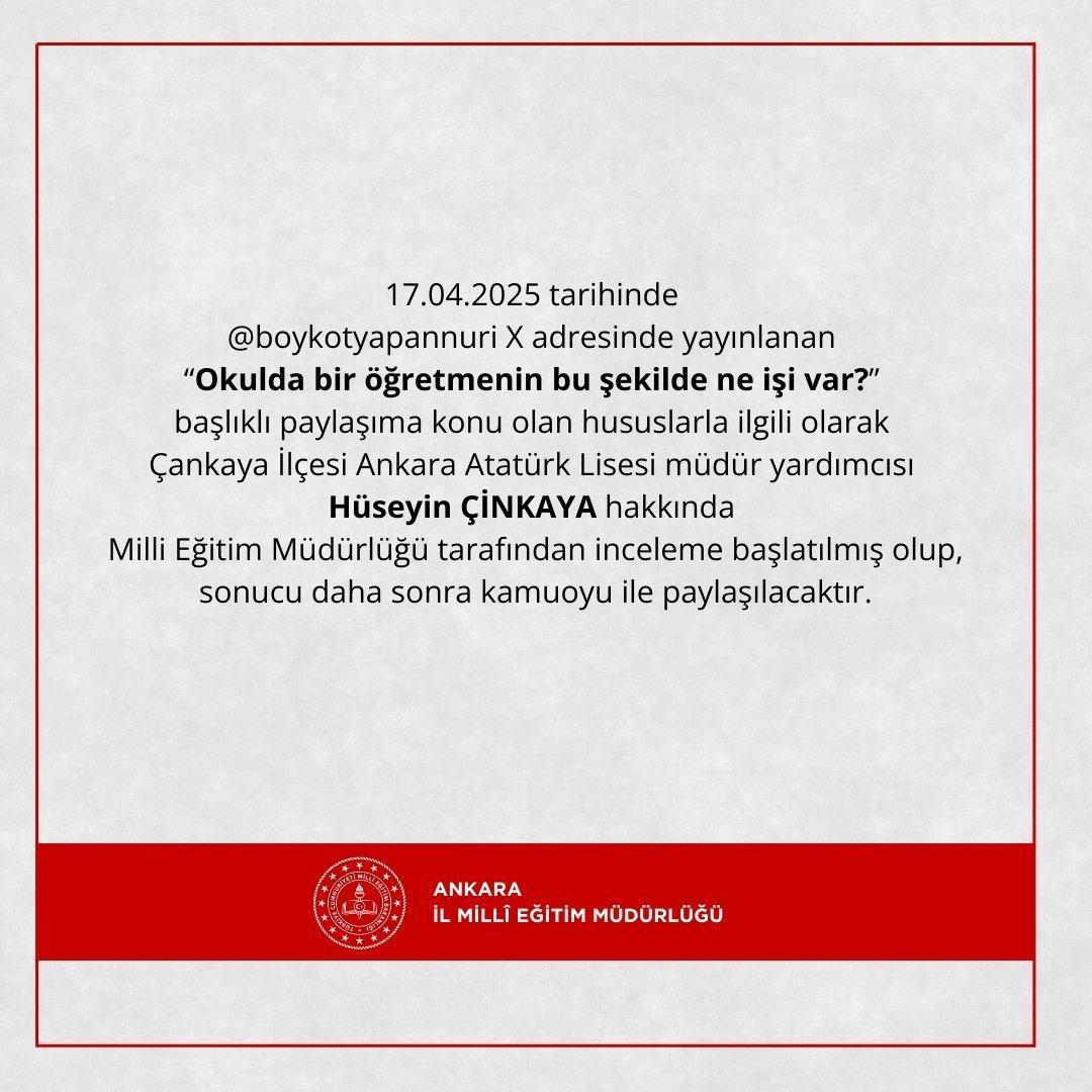 Ankara İl Milli Eğitim Müdürlüğü sosyal medya hesabından yapılan paylaşımda, "@boykotyapannuri X adresinde yayınlanan 'Okulda bir öğretmenin bu şekilde ne işi var?' başlıklı paylaşıma konu olan hususlarla ilgili olarak Çankaya ilçesi Ankara Atatürk Lisesi müdür yardımcısı Hüseyin Çinkaya hakkında, Milli Eğitim Müdürlüğü tarafından inceleme başlatılmış olup, sonucu daha sonra kamuoyu ile paylaşılacaktır" ifadeleri kullanıldı. (DHA)