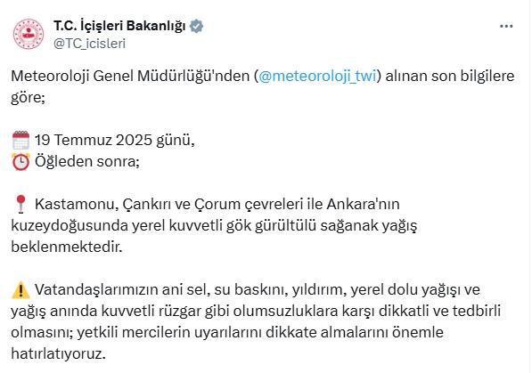 Bakanlığın sosyal medya hesabından yapılan açıklamada, Meteoroloji Genel Müdürlüğü'nden alınan son bilgilere göre; bugün öğleden sonra, Kastamonu, Çankırı ve Çorum çevreleri ile Ankara'nın kuzeydoğusunda yerel kuvvetli gök gürültülü sağanak yağış beklendiği belirtildi. Açıklamada, vatandaşların ani sel, su baskını, yıldırım, yerel dolu yağışı ve yağış anında kuvvetli rüzgar gibi olumsuzluklara karşı dikkatli ve tedbirli olmaları, yetkili mercilerin uyarılarını dikkate almalarını uyarısında bulunuldu.