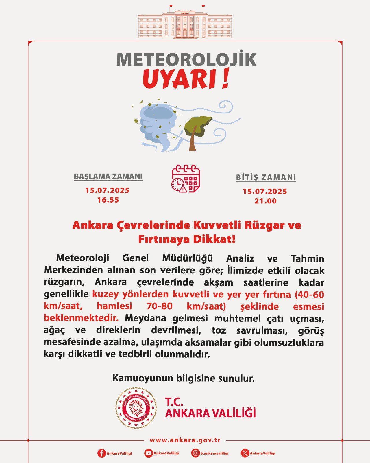 ANKARA, (DHA)- ANKARA Valiliği, kentte etkili olması beklenen kuvvetli rüzgar ve fırtına için uyarıda bulundu.