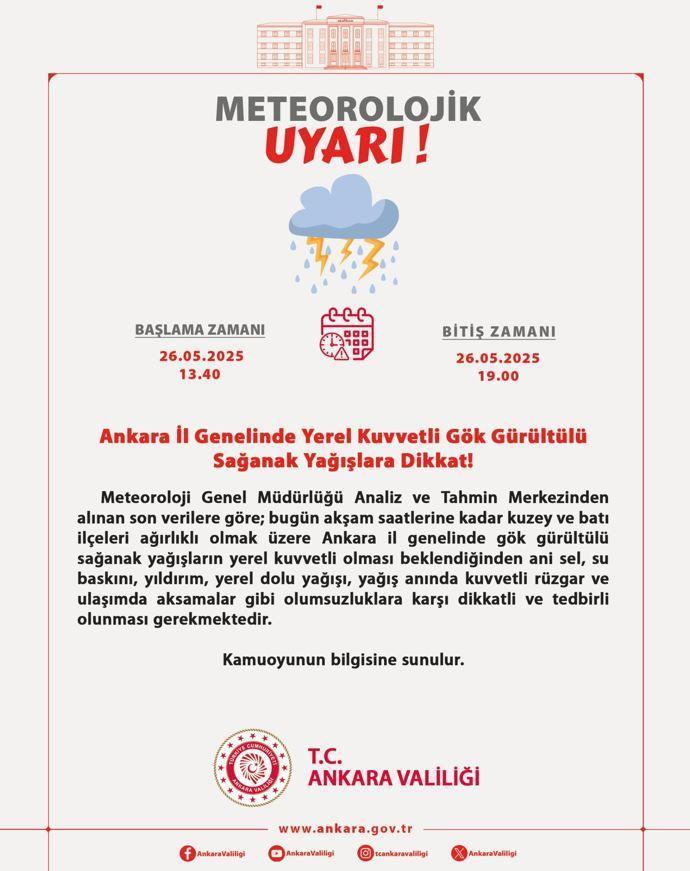 Valiliğin sosyal medya hesabından yapılan açıklamada, “Meteoroloji Genel Müdürlüğü Analiz ve Tahmin Merkezinden alınan son verilere göre; bugün akşam saatlerine kadar kuzey ve batı ilçeleri ağırlıklı olmak üzere Ankara il genelinde gök gürültülü sağanak yağışların yerel kuvvetli olması beklendiğinden ani sel, su baskını, yıldırım, yerel dolu yağışı, yağış anında kuvvetli rüzgar ve ulaşımda aksamalar gibi olumsuzluklara karşı dikkatli ve tedbirli olunması gerekmektedir” denildi.