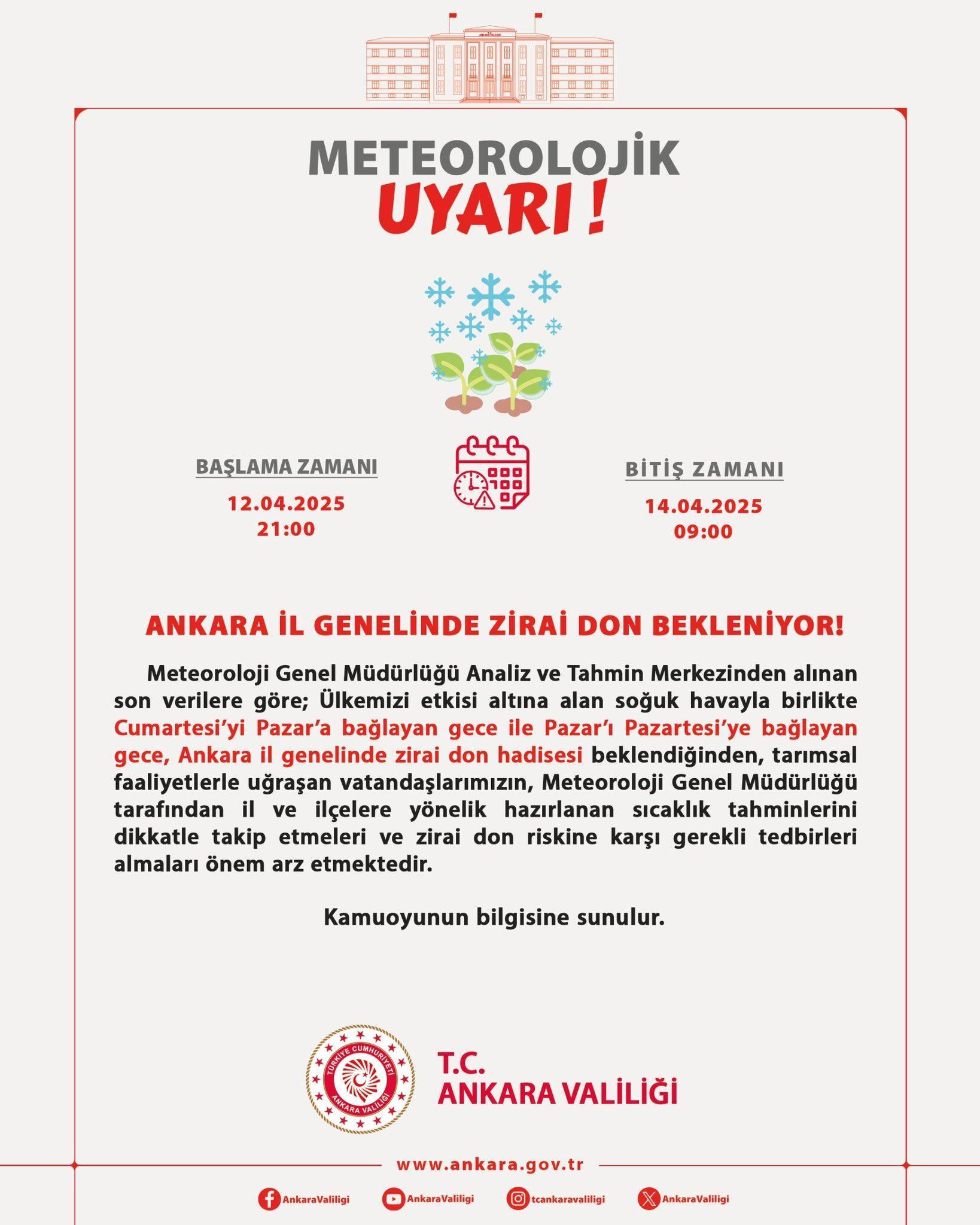 Valiliğin sosyal medya hesabından yapılan açıklamada, "Meteoroloji Genel Müdürlüğü Analiz ve Tahmin Merkezinden alınan son verilere göre, ülkemizi etkisi altına alan soğuk havayla birlikte Cumartesi'yi Pazar'a bağlayan gece ile Pazar'ı Pazartesi'ye bağlayan gece, Ankara il genelinde zirai don hadisesi beklendiğinden, tarımsal faaliyetlerle uğraşan vatandaşlarımızın, Meteoroloji Genel Müdürlüğü tarafından il ve ilçelere yönelik hazırlanan sıcaklık tahminlerini dikkatle takip etmeleri ve zirai don riskine karşı gerekli tedbirleri almaları önem arz etmektedir" denildi. (DHA)