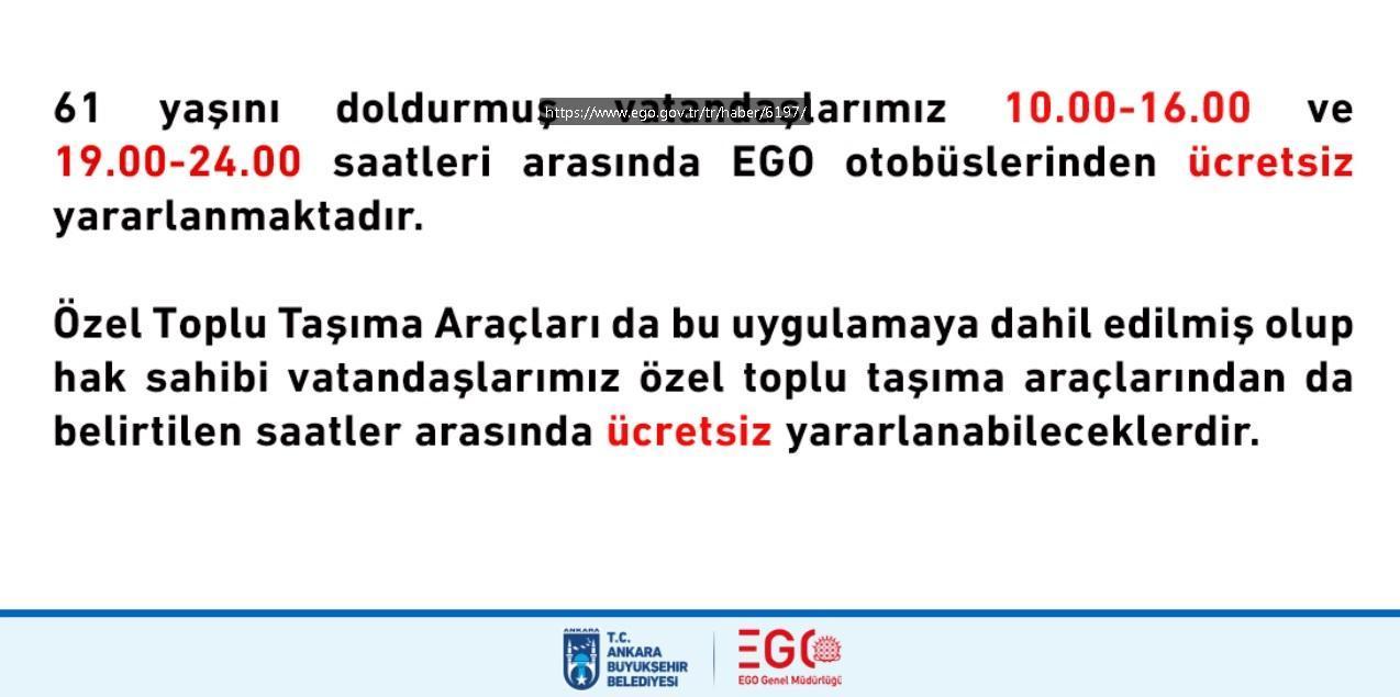 61 yaşını doldurmuş vatandaşlar, gün içerisinde 10.00-16.00 ve 19.00-24.00 saatleri arasında EGO otobüslerinden ücretsiz faydalanabilmekteydi. Ankara Büyükşehir Belediyesi EGO Genel Müdürlüğü'nden yapılan açıklamada, uygulamanın genişletilerek 'Özel Toplu Taşıma Araçları'nın da dahil edildiğini duyurdu. Hak sahibi vatandaşların özel toplu taşıma araçlarından da belirtilen saatler arasında ücretsiz yararlanabileceği açıklandı. (DHA)