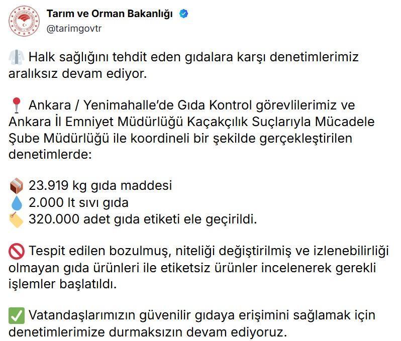 Bakanlığın Next Sosyal hesabından yapılan açıklamada, "Halk sağlığını tehdit eden gıdalara karşı denetimlerimiz aralıksız devam ediyor. Ankara Yenimahalle'de Gıda Kontrol görevlilerimiz ve Ankara İl Emniyet Müdürlüğü Kaçakçılık Suçlarıyla Mücadele Şube Müdürlüğü ile koordineli bir şekilde gerçekleştirilen denetimlerde, 23 bin 919 kilogram gıda maddesi, 2 bin litre sıvı gıda ve 320 bin adet gıda etiketi ele geçirildi. Tespit edilen bozulmuş, niteliği değiştirilmiş ve izlenebilirliği olmayan gıda ürünleri ile etiketsiz ürünler incelenerek gerekli işlemler başlatıldı. Vatandaşlarımızın güvenilir gıdaya erişimini sağlamak için denetimlerimize durmaksızın devam ediyoruz" ifadelerine yer verdi. (DHA)