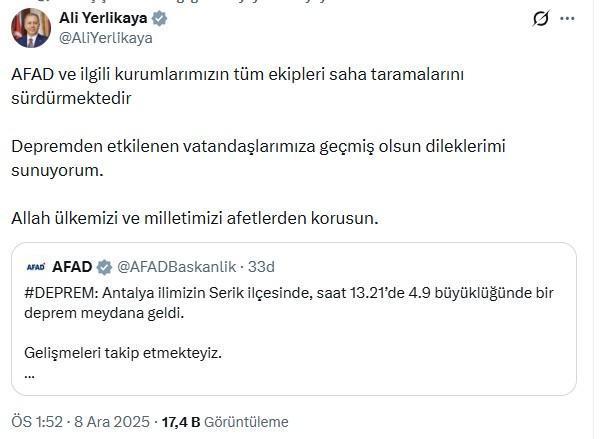 İçişleri Bakanı Ali Yerlikaya, Antalya Serik'te meydana gele 4.9'luk depreme ilişkin sosyal medya hesabından yaptığı açıklamada, "AFAD ve ilgili kurumlarımızın tüm ekipleri saha taramalarını sürdürmektedir. Depremden etkilenen vatandaşlarımıza geçmiş olsun dileklerimi sunuyorum. Allah ülkemizi ve milletimizi afetlerden korusun" ifadelerini kullandı.