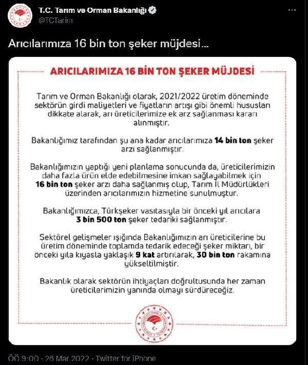 Bakanlıktan yapılan yazılı açıklamada, bakanlık olarak 2021/2022 üretim döneminde sektörün girdi maliyetleri ve fiyatların artışı gibi önemli hususları dikkate alarak, arı üreticilerine ek arz sağlanması kararı alındığı belirtildi. Bakanlık tarafından üretim döneminde şu ana kadar arıcılara 14 bin ton şeker arzı sağlandığı belirtilerek, "Bakanlığımızın yaptığı yeni planlama sonucunda da, üreticilerimizin daha fazla ürün elde edebilmesine imkan sağlayabilmek için 16 bin ton şeker arzı daha sağlanmış olup, Tarım İl Müdürlükleri üzerinden arıcılarımızın hizmetine sunulmuştur" denildi.