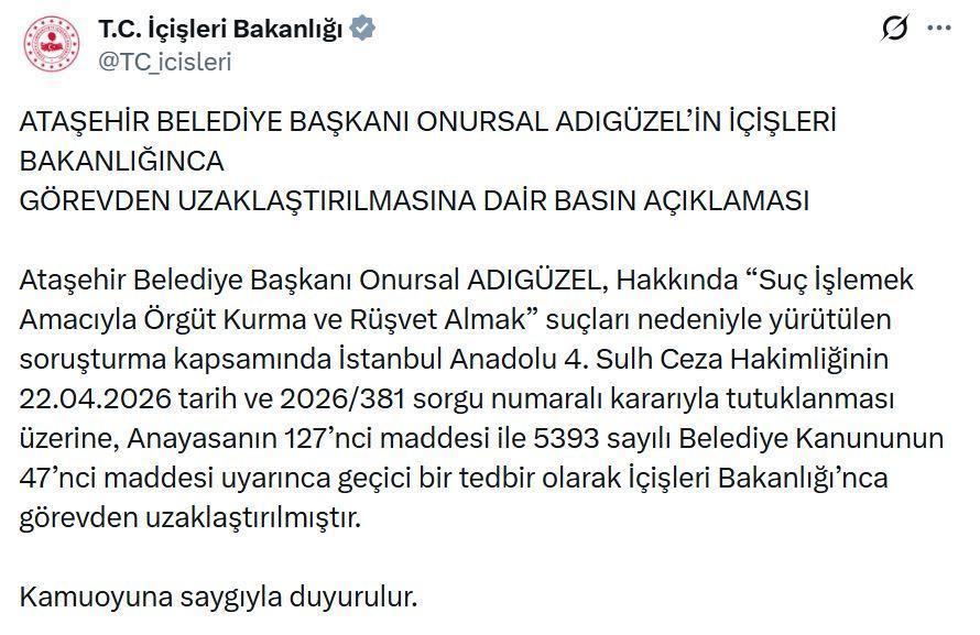 Bakanlığın sanal medya hesabından yapılan açıklamada, "Ataşehir Belediye Başkanı Onursal Adıgüzel, hakkında 'Suç İşlemek Amacıyla Örgüt Kurma ve Rüşvet Almak' suçları nedeniyle yürütülen soruşturma kapsamında İstanbul Anadolu 4'üncü Sulh Ceza Hakimliğinin 22.04.2026 tarih ve 2026/381 sorgu numaralı kararıyla tutuklanması üzerine, Anayasanın 127’nci maddesi ile 5393 sayılı Belediye Kanununun 47’nci maddesi uyarınca geçici bir tedbir olarak İçişleri Bakanlığı’nca görevden uzaklaştırılmıştır" denildi. (DHA)