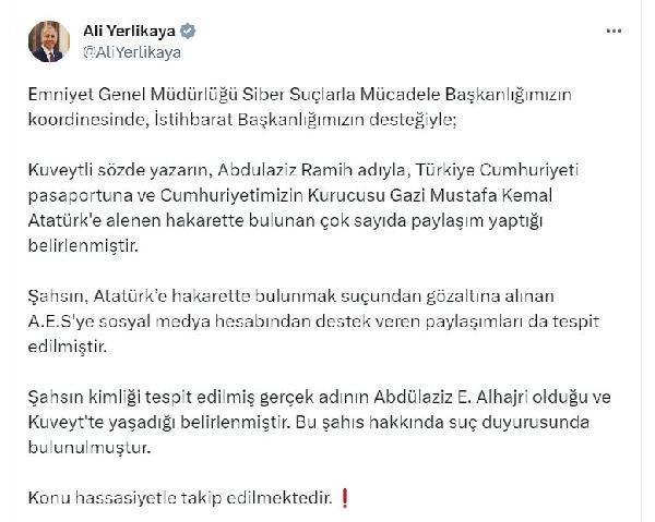Bakan Yerlikaya, sosyal medya hesabından yaptığı açıklamada, "Emniyet Genel Müdürlüğü Siber Suçlarla Mücadele Başkanlığımızın koordinesinde, İstihbarat Başkanlığımızın desteğiyle; Kuveytli sözde yazarın, 'Abdulaziz Ramih' adıyla, Türkiye Cumhuriyeti pasaportuna ve Cumhuriyetimizin Kurucusu Gazi Mustafa Kemal Atatürk'e alenen hakarette bulunan çok sayıda paylaşım yaptığı belirlenmiştir. Şahsın, Atatürk’e hakarette bulunmak suçundan gözaltına alınan A.E.S.'ye sosyal medya hesabından destek veren paylaşımları da tespit edilmiştir. Şahsın kimliği tespit edilmiş gerçek adının Abdülaziz E. Alhajri olduğu ve Kuveyt'te yaşadığı belirlenmiştir. Bu şahıs hakkında suç duyurusunda bulunulmuştur. Konu hassasiyetle takip edilmektedir" dedi. Abdülaziz E. Alhajri'nin, saç ektirmek için 2 kez Türkiye'ye geldiği de tespit edildi. (DHA)