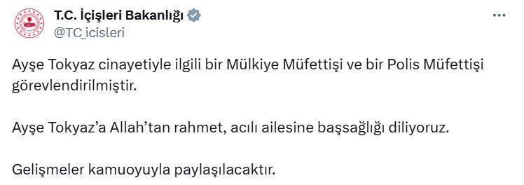 Bakanlığın sosyal medya hesabından yapılan açıklamada, "Ayşe Tokyaz cinayetiyle ilgili bir mülkiye müfettişi ve bir polis müfettişi görevlendirilmiştir. Ayşe Tokyaz’a Allah’tan rahmet, acılı ailesine başsağlığı diliyoruz. Gelişmeler kamuoyuyla paylaşılacaktır" denildi. (DHA)