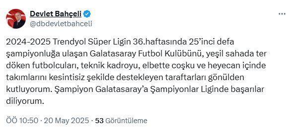 ANKARA, (DHA)- MHP Genel Başkanı Devlet Bahçeli, Galatasaray futbol takımının 25'inci lig şampiyonluğunu kutladı.