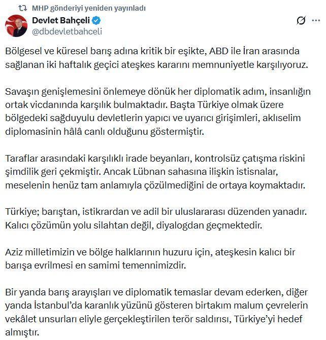 MHP Genel Başkanı Bahçeli, sanal medya hesabından yaptığı açıklamada, "Bölgesel ve küresel barış adına kritik bir eşikte, ABD ile İran arasında sağlanan 2 haftalık geçici ateşkes kararını memnuniyetle karşılıyoruz. Savaşın genişlemesini önlemeye dönük her diplomatik adım, insanlığın ortak vicdanında karşılık bulmaktadır. Başta Türkiye olmak üzere bölgedeki sağduyulu devletlerin yapıcı ve uyarıcı girişimleri, aklıselim diplomasinin hala canlı olduğunu göstermiştir. Taraflar arasındaki karşılıklı irade beyanları, kontrolsüz çatışma riskini şimdilik geri çekmiştir. Ancak Lübnan sahasına ilişkin istisnalar, meselenin henüz tam anlamıyla çözülmediğini de ortaya koymaktadır. Türkiye; barıştan, istikrardan ve adil bir uluslararası düzenden yanadır. Kalıcı çözümün yolu silahtan değil, diyalogdan geçmektedir" ifadelerini kullandı.