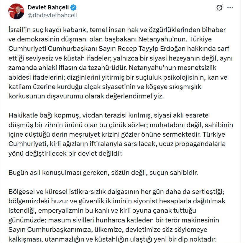 MHP Genel Başkanı Devlet Bahçeli, sanal medya hesabından yaptığı açıklamada, "İsrail’in suç kaydı kabarık, temel insan hak ve özgürlüklerinden bihaber ve demokrasinin düşmanı olan başbakanı Netanyahu'nun, Türkiye Cumhuriyeti Cumhurbaşkanı Sayın Recep Tayyip Erdoğan hakkında sarf ettiği seviyesiz ve küstah ifadeler; yalnızca bir siyasi hezeyanın değil, aynı zamanda ahlaki iflasın da tezahürüdür. Netanyahu’nun mesnetsizlik abidesi ifadelerini; dizginlerini yitirmiş bir suçluluk psikolojisinin, kan ve katliam üzerine kurduğu alçak siyasetinin ve köşeye sıkışmışlık korkusunun dışavurumu olarak değerlendirmeliyiz. Hakikatle bağı kopmuş, vicdan terazisi kırılmış, siyasi aklı esarete düşmüş bir zihnin ürünü olan bu çürük sözler; muhatabını değil, sahibinin içine düştüğü derin meşruiyet krizini gözler önüne sermektedir. Türkiye Cumhuriyeti, kirli ağızların iftiralarıyla sarsılacak, ucuz propagandalarla yönü değiştirilecek bir devlet değildir" ifadelerine yer verdi.
