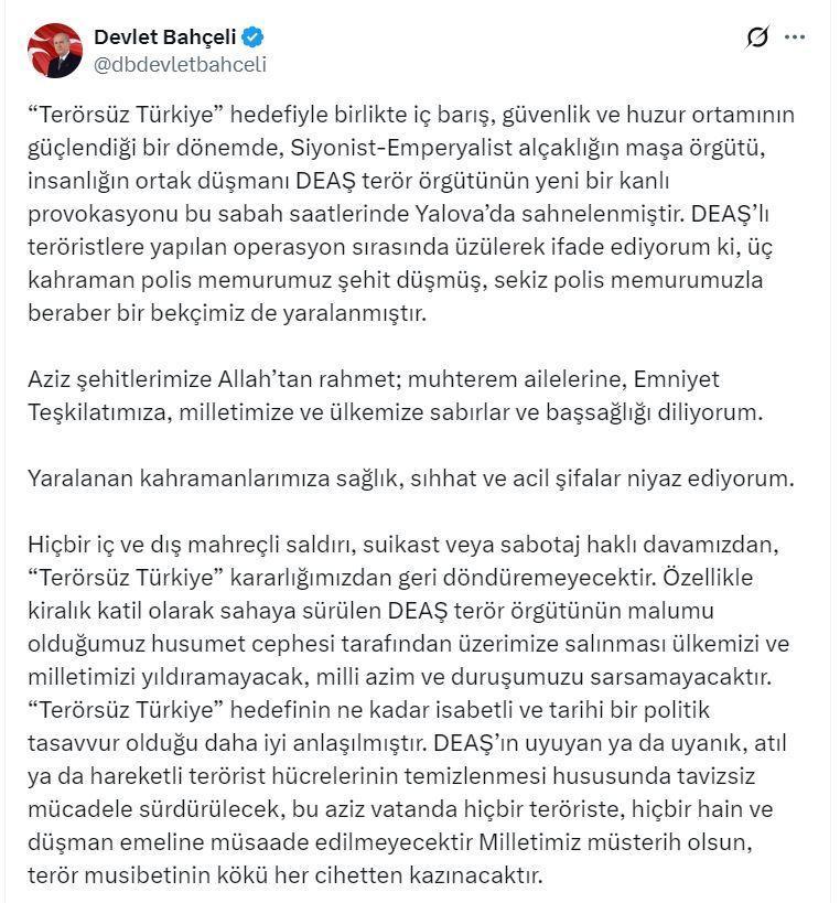 MHP Lideri Devlet Bahçeli, sanal medya hesabından yaptığı açıklamada, "Terörsüz Türkiye' hedefiyle birlikte iç barış, güvenlik ve huzur ortamının güçlendiği bir dönemde, Siyonist-Emperyalist alçaklığın maşa örgütü, insanlığın ortak düşmanı DEAŞ terör örgütünün yeni bir kanlı provokasyonu, bu sabah saatlerinde Yalova'da sahnelenmiştir. DEAŞ'lı teröristlere yapılan operasyon sırasında üzülerek ifade ediyorum ki, 3 kahraman polis memurumuz şehit düşmüş, 8 polis memurumuzla beraber 1 bekçimiz de yaralanmıştır. Aziz şehitlerimize Allah’tan rahmet; muhterem ailelerine, Emniyet Teşkilatımıza, milletimize ve ülkemize sabırlar ve başsağlığı diliyorum. Yaralanan kahramanlarımıza sağlık, sıhhat ve acil şifalar niyaz ediyorum" ifadelerini kullandı.