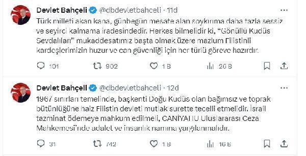 MHP Lideri Bahçeli, sosyal medya hesabından yaptığı açıklamada, "7 Ekim 2023 tarihinden bu yana dünyanın ve beşeriyetin nadiren şahit olduğu en ağır katliamlardan biri ve hatta soykırıma varan kanlı tablo Gazze'yi mahvı perişan etmiştir. Haksız, hukuksuz ve insanlık dışı İsrail saldırıları sonucunda sayıları 16 bini aşan Filistinli kardeşimiz hayattan koparılmış, on binlerce Filistinli kardeşimiz yaralanmıştır. İsrail vahşet ve şiddet politikalarıyla aleni insanlık suçu işlemiştir. 24 Kasım 2023 tarihinden itibaren ilan edilen ve 3 kez de uzatılan geçici ateşkesi bugün sabah saatlerinde sonlandıran İsrail, acımasız ve ahlaksız saldırılarına tekrar başlamıştır. Masum bir halkın tepesinden bombalar atılmakta, anne ve babalarının öpüp koklamaya kıyamadığı çocuklar katledilmekte, savunmasız bir halk canlı hedef haline getirilmektedir" ifadelerini kullandı.