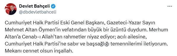 MHP Genel Başkanı Devlet Bahçeli, sosyal medya hesabından yaptığı paylaşımda "Cumhuriyet Halk Partisi Eski Genel Başkanı, Gazeteci-Yazar Sayın Mehmet Altan Öymen’in vefatından büyük bir üzüntü duydum. Merhum Altan’a Cenab-ı Allah’tan rahmetler niyaz ediyor; acılı ailesine, Cumhuriyet Halk Partisi’ne sabır ve başsağlığı temennilerimi iletiyorum. Mekanı cennet olsun inşallah" ifadeleri yer aldı. (DHA)