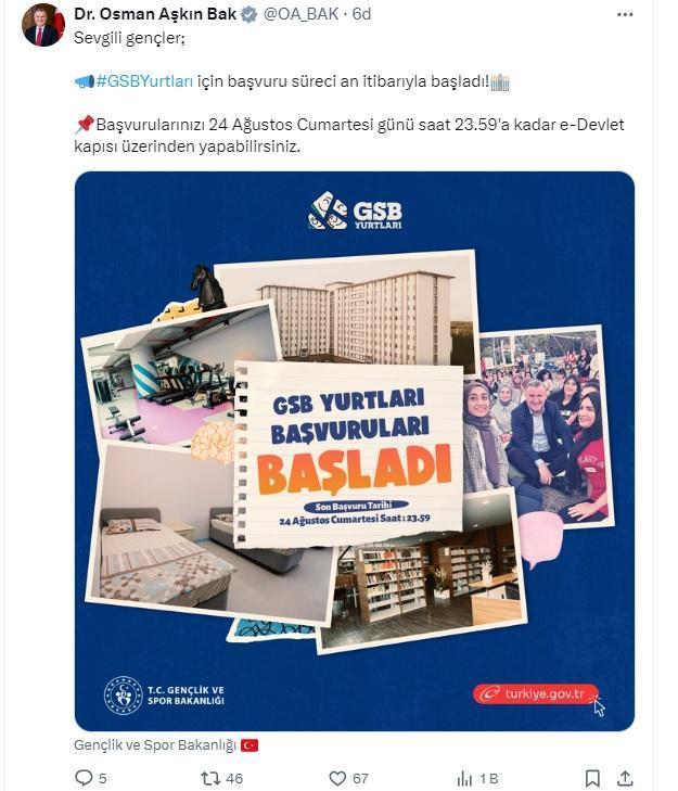 Gençlik ve Spor Bakanı Osman Aşkın Bak, sosyal medya hesabından yaptığı açıklamada, "Sevgili gençler; GSB yurtları için başvuru süreci an itibarıyla başladı. Başvurularınızı 24 Ağustos Cumartesi günü saat 23.59'a kadar e-Devlet kapısı üzerinden yapabilirsiniz" dedi.