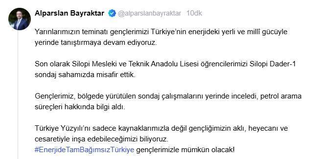 Bakanlıktan yapılan yazılı açıklamaya göre, Enerji ve Tabii Kaynaklar Bakanlığı'ndan, Silopi Mesleki ve Teknik Anadolu Lisesi öğrencilerini Silopi'de petrol arama faaliyetlerinin sürdüğü Dader-1 Sondaj Sahası’nda ağırladı. Yaşadıkları bölgede yürütülen sondaj çalışmalarını yakından görme fırsatı yakalayan öğrenciler, Türkiye’nin enerji alanındaki hedefleri konusunda da bilgiler edindi. Türkiye’nin enerji alanında yürüttüğü çalışmalara ilişkin sorularını Türkiye Petrolleri’nin uzman isimlerine yöneltme fırsatı bulan öğrenciler, bol bol hatıra fotoğrafı da çektirdi.