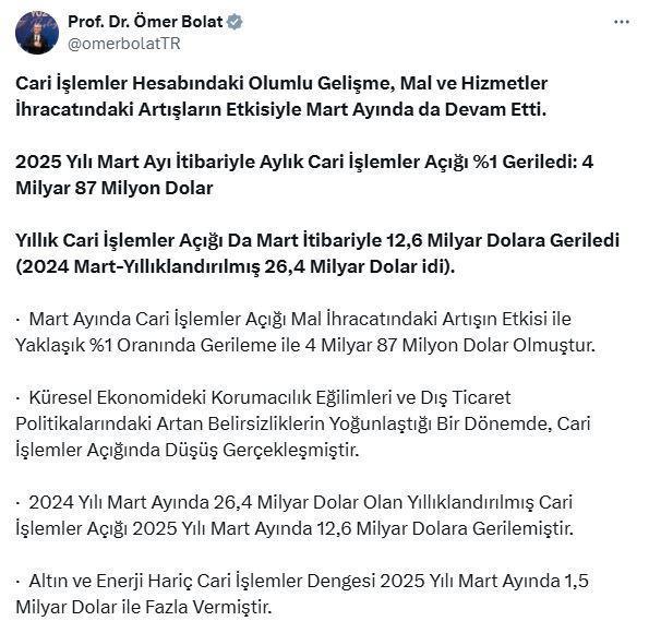 ANKARA, (DHA)- TİCARET Bakanı Ömer Bolat, "Cari işlemler açığının 2025 yılı genelinde yukarı yönlü seyredeceği beklenmekle birlikte, GSYH (gayrisafi yurt içi hasıla) içindeki payı tarihsel ortalamanın altında kalmaya devam edecektir" dedi.