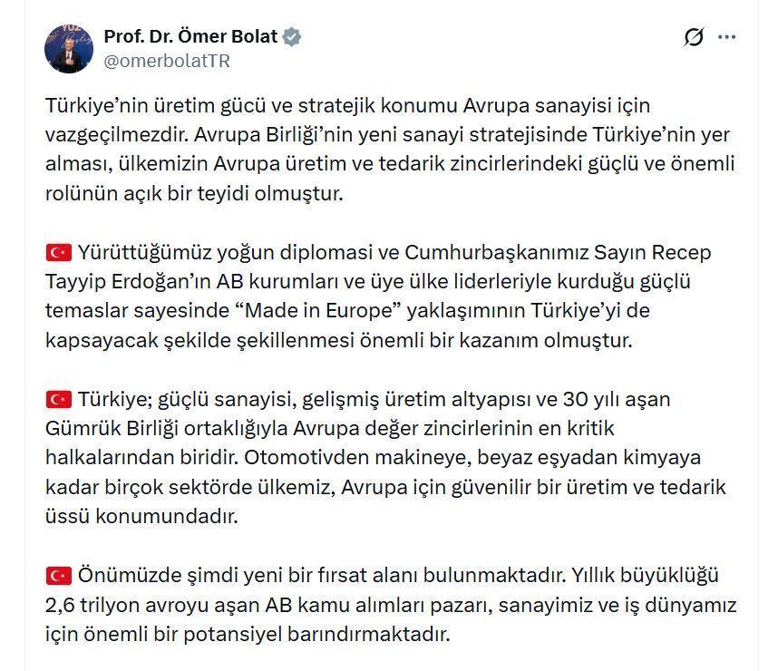 Bakan Bolat, sanal medya hesabından yaptığı açıklamada, "Türkiye’nin üretim gücü ve stratejik konumu Avrupa sanayisi için vazgeçilmezdir. Avrupa Birliği’nin yeni sanayi stratejisinde Türkiye’nin yer alması, ülkemizin Avrupa üretim ve tedarik zincirlerindeki güçlü ve kritik rolünün açık bir teyidi olmuştur. Yürüttüğümüz yoğun diplomasi ve Cumhurbaşkanımız Sayın Recep Tayyip Erdoğan’ın AB kurumları ve üye ülke liderleriyle kurduğu güçlü temaslar sayesinde 'Made in Europe' yaklaşımının Türkiye’yi de kapsayacak şekilde şekillenmesi önemli bir kazanım olmuştur. Türkiye; güçlü sanayisi, gelişmiş üretim altyapısı ve 30 yılı aşan Gümrük Birliği ortaklığıyla Avrupa değer zincirlerinin en kritik halkalarından biridir" dedi.