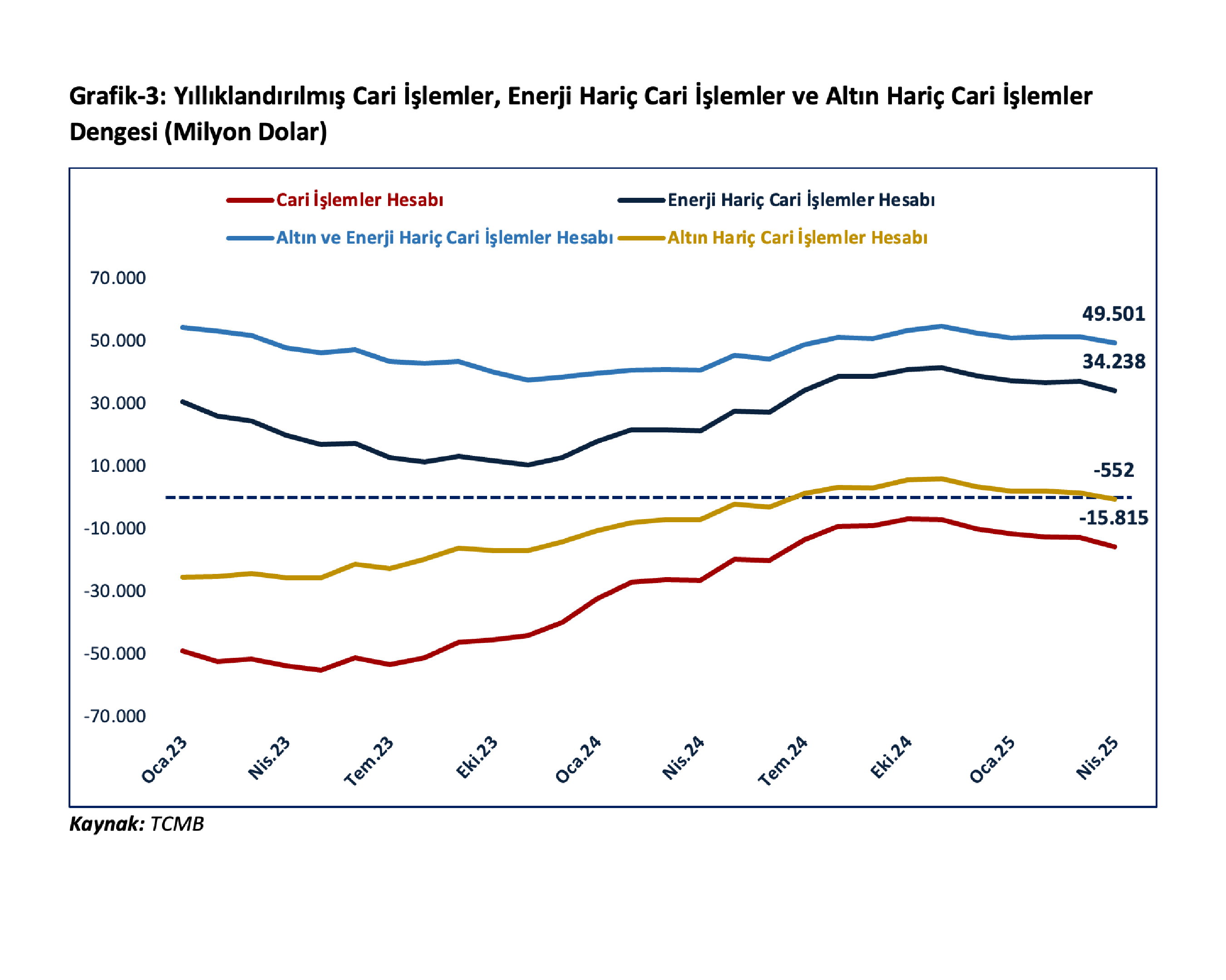 Hükümet olarak mal ve hizmet ihracatını artırmaya ve yerli milli üretimi desteklemeye yönelik politikaları kararlılıkla sürdüreceklerini vurgulayan Bolat, "Cari işlemler hesabında istikrarlı bir seyir sağlanacak ve makroekonomik istikrar güçlendirilecektir. İnovasyon-üretim-yatırım-istihdam-ihracat-adil bölüşüm önceliklerinde oluşturulan kalkınma stratejimiz ile önümüzdeki dönemde Türkiye ekonomisini bölgesinde ve küresel arenada cazibe merkezi olarak öne çıkarmak amacıyla çalışmalarımızı cumhurbaşkanımızın önderliğinde kararlılıkla sürdüreceğiz. Küresel ekonomideki korumacılık eğilimleri ve dış ticaret politikalarındaki artan belirsizliklerin yoğunlaştığı bir dönemde, 2025 yılı nisan ayında cari işlemler açığında geçici bir artış yaşanırken, mayıs ayına ilişkin öncü veriler önemli oranda gerilemeye işaret etmektedir. 2025 yılı nisan ayında mal ihracatımız yüzde 7,8 oranında artışla 20,8 milyar dolara yükselirken, aynı dönemde ithalatımız yüzde 12,7 oranında artarak 12,7 milyar dolar olmuştur. Böylece en yüksek ikinci nisan ayı ihracatı gerçekleşmiştir. İthalattaki artışta altın ithalatının yüzde 54 artışla 2,4 milyar dolar gerçekleşmesi etkili bir unsurken, bu artışta da fiyatlardaki artışın belirleyici olduğu dikkat çekmektedir. Böylelikle dış ticaret açığımız yüzde 22,3 artışla 12,1 milyar dolar ve ihracatın ithalatı karşılama oranı yüzde 2,9 puan azalışla yüzde 63,2 olarak gerçekleşmiştir" açıklamasında bulundu.