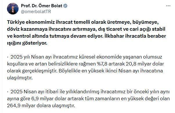 Ticaret Bakanı Ömer Bolat, dış ticaret istatistiklerine ilişkin sosyal medya hesabından açıklama yaptı. Bakan Bolat, Türkiye ekonomisinin ihracat temelli olarak büyümeye devam ettiğini belirterek, "İlkbahar, ihracatla beraber ışığını gösteriyor. 2025 yılı Nisan ayı ihracatımız, küresel ekonomide yaşanan olumsuz koşullara ve artan belirsizliklere rağmen yüzde 7,8 artarak 20,8 milyar dolar olarak gerçekleşmiştir. Böylelikle en yüksek ikinci nisan ayı ihracatına ulaşılmıştır. 2025 Nisan ayı itibarı ile yıllıklandırılmış ihracatımız bir önceki yılın aynı ayına göre 6,9 milyar dolar artarak tüm zamanların en yüksek değeri olan 264,9 milyar dolara ulaşmıştır. AB-27'nin yıllıklandırılmış ithalatının hala yatay seyrini koruması, tarife artışlarının getirdiği belirsizlik ve Çin'in ihracat fiyatlarını düşürmeye devam etmesiyle beraber gelen zorlu rekabet koşullarına rağmen ihracatımızda artış devam etmektedir" dedi.